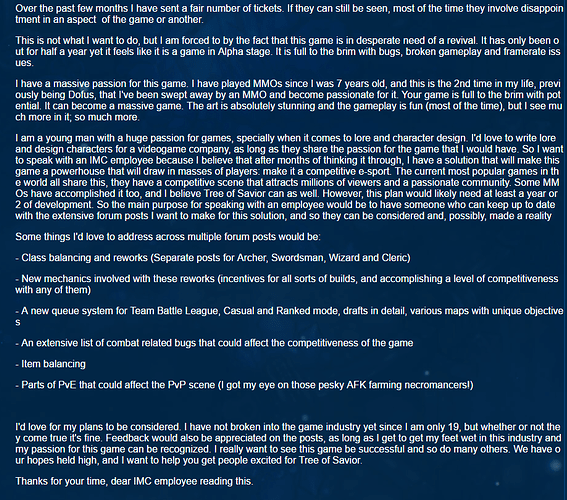 And because of that, considering I hope to one day work in concept art, character design, and lore writing, I wanted to help IMC and get my feet wet in this industry by giving them an extensive list of ideas that would make a 1-year or 2-year plan to make this game competitive and, therefore, prone to success. This is the ticket I sent to IMC: