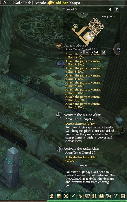 Quando a pessoa possui muitas quests e vão para o lado direito da tela (o “atalho” de andamento da quest) elas simplesmente ficam jogadas lá. Algumas quests possuem vários requisitos, o que resulta em ela ficar fora da área visível da tela. (Exemplo na imagem)