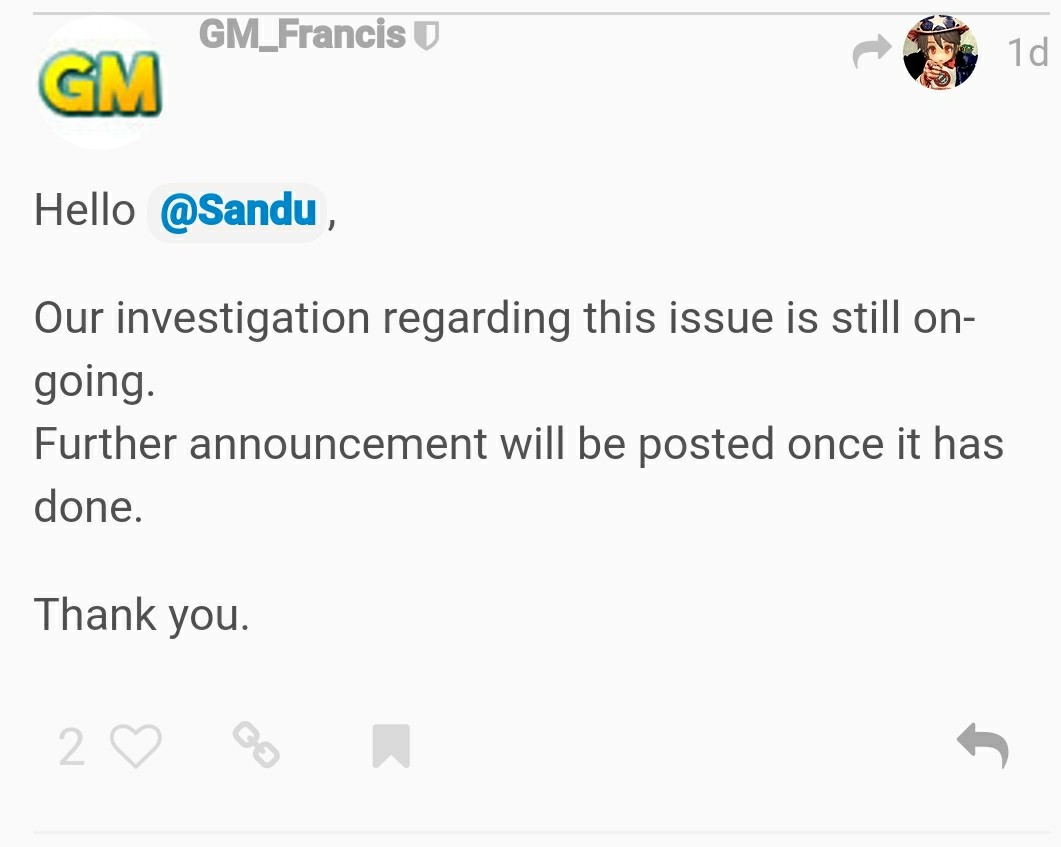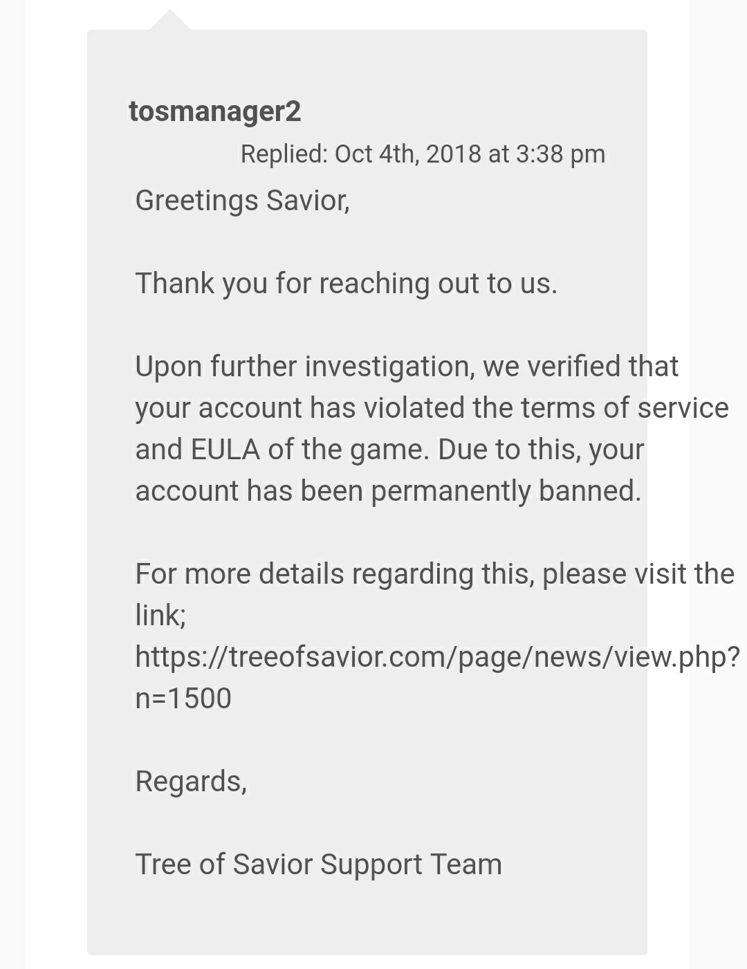 I expected an actual answer to my previous ticket and yet i received an autoresponder that did nothing to help my case and the case of many others who got wrongfully banned. GM Francis said that you’re still undergoing more investigation into the matter and yet your autoresponders are giving less hope to the players by saying that our accounts are now “permanently banned” after violating rules. No proper explanation and no closure on the topic.
