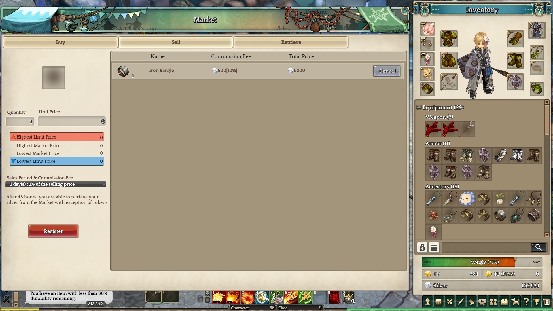 After the maintenance with the broken string names, I can’t cancel my auctioned item mainly the Iron Bangle shown! Thing is before applying the fix for the broken string names, I tried clicking the broken string for cancel when searching for the Iron Bangle in auction house, now I can’t cancel the damn thing.