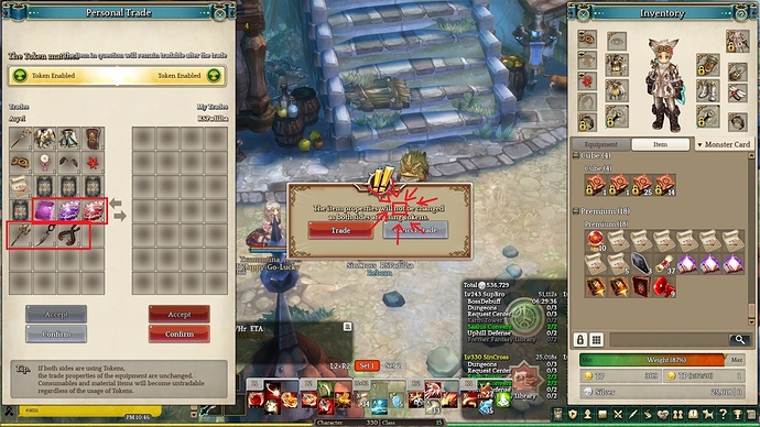 - Have both trade parties confirm the deal, a window pops up “the item properties will not change, because both have token active”