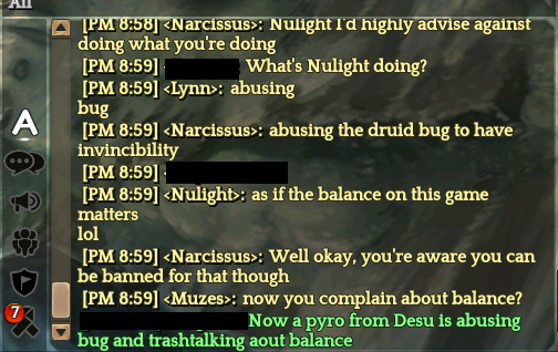 I was also discussing it with the eyewitness from Valhalla, Narcissus, who I was with at the time when I was livecasting (?) to my guild via text. Then, one of the Desu member, nulight, declared that he doesn’t care that he’s using bug abuse.