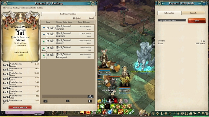 And not just us, everyone. Crimson, Diamond, and Ohayou all still have their accumulated victories and score from the last several weeks. Of course, every other guild is showing the same issue: it doesn’t matter if you win or lose, because our scores are permanently stuck to those accumulated values. And this has been happening for almost three months now.