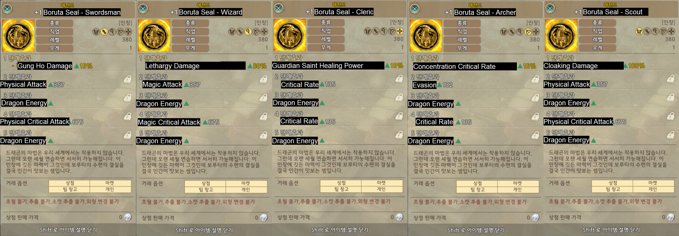 There are two kinds of seals currently in the game: Kaze seals and Boruta seals. Kaze seals are named after the Kupole, Kaze, who helps you enter the content. Every base class has their own Kaze seal and Boruta seal with their own stats.