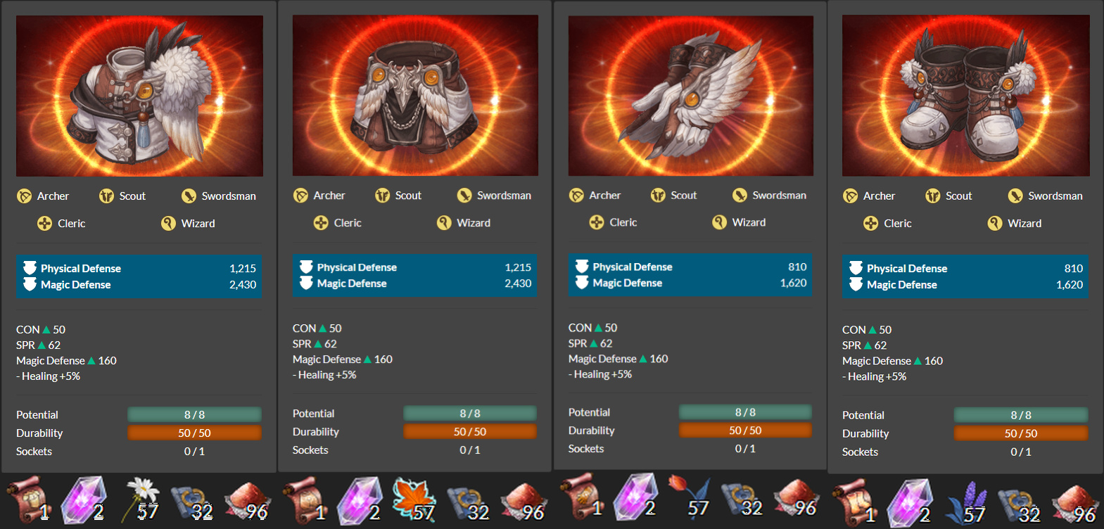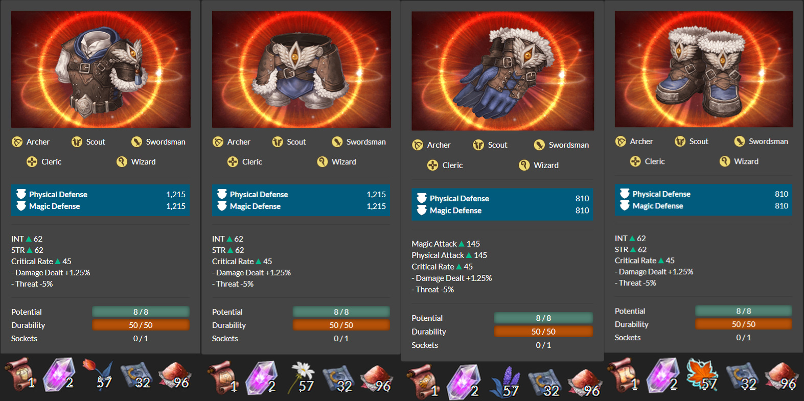 I’ve previously posted the first batch of armor here. Here are the new sets. For convenience, I also included the materials required to craft each piece.