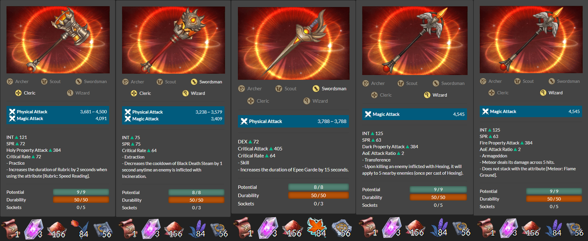 I’ve previously posted the first batch of weapons here. Here are the new weapons. For convenience, I also included the materials required to craft each piece.