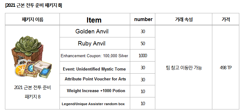 50 unique/legendary assisters, 5 enhancement arts fully maxed without attribute points , 500 million silver discount, 250 ruby anvils, 150 golden anvils, 50000 weight limit, you only have to buy 2490 TP(around 175$$).