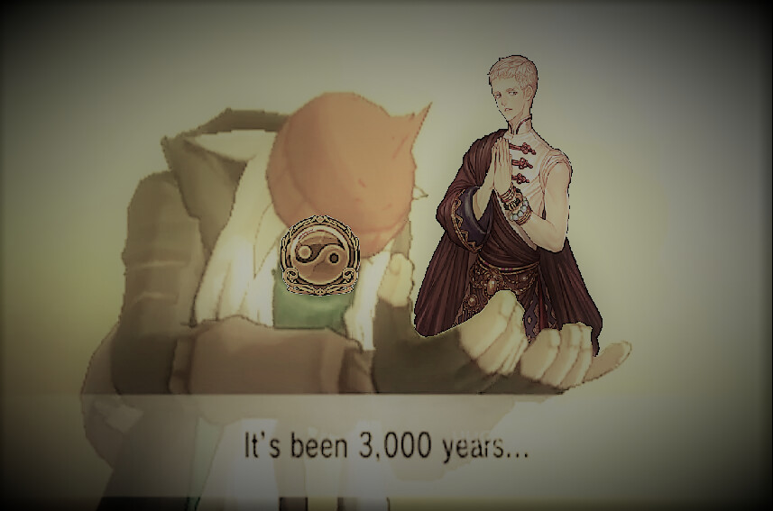 i myself flabbergasted by the fact that the two other guy looking into him sorta make funny of him lol. i just chose it because hes the only one sit on the floor while everyone else basically on top of some sort of temple, even if its just on the stair like lol