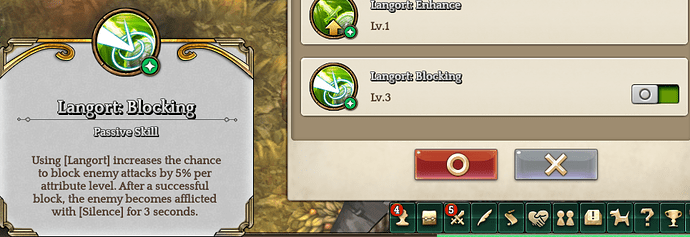 Skill LANGORT, Attribute Langort Blocking, using langort never get block bonus and never silence enemy after successful block