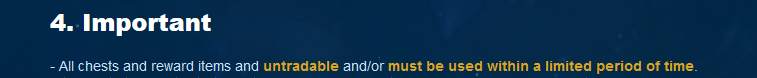 I’m pretty sure its not gonna be tradeable. They said it and there is limited time so probably 14 days to use like every other limited time event item which is not storageable through team storage.