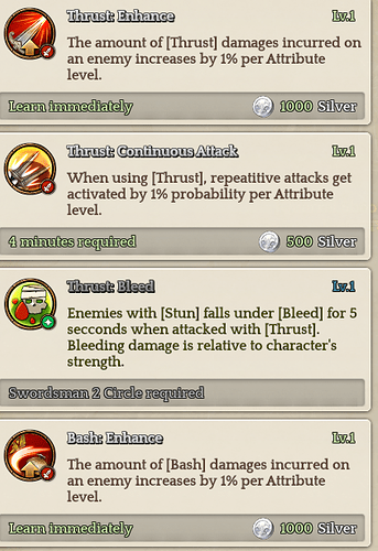 -Thrust: Bleed - { Enemies with [Stun] falls under [Bleed] } should be “Enemies with [Stun] are inflicted with [Bleed]”