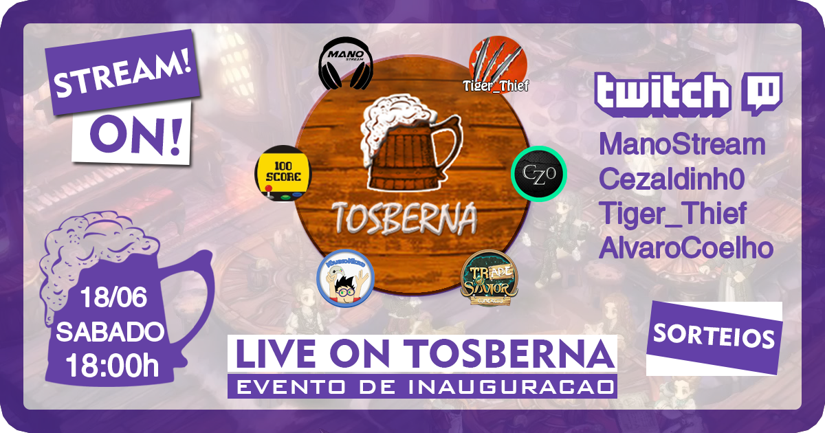 Amanhã as 18 horas, será oficialmente inaugurada a Tosberna. No evento contaremos com a participação de 4 Streamers e muitos sorteios.