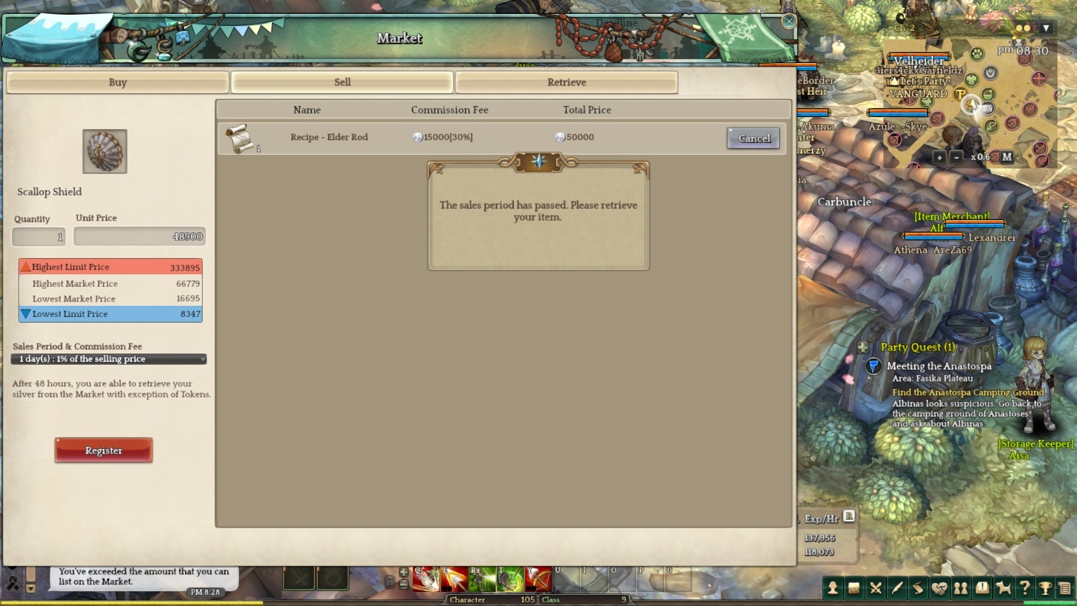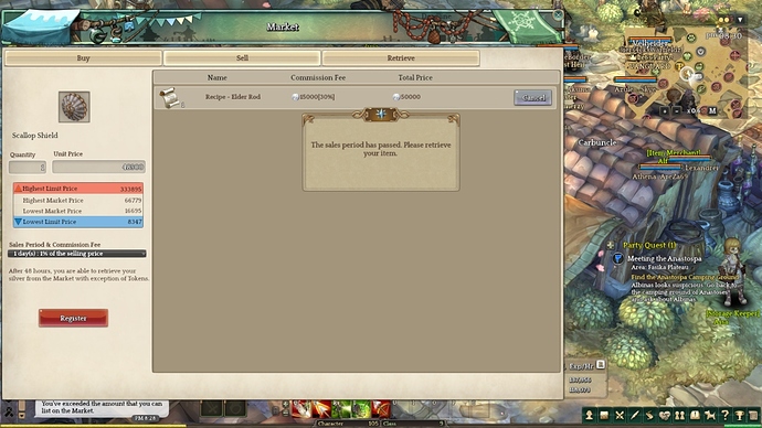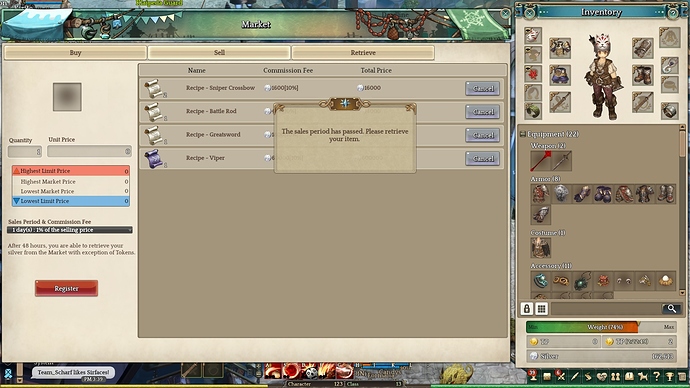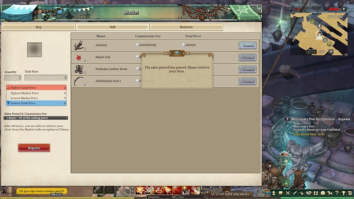 Description : same as others, I cannot retrieve expired item [Recipe - Sniper Crossbow] from the market