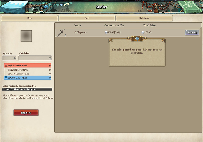 Description: Cannot retrieve expired item (+6 Claymore). I donât use tokens YET (but may be forced to), so I cannot sell at all with this bug. Tried changing towns & channels, attempted to sell a new item and relogged several times to no avail. Please fix ASAP.