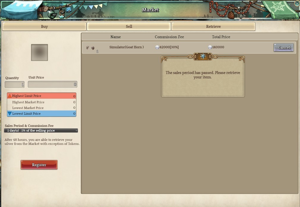 Description : same as others, I cannot retrieve expired item [Goat Horn] from the market