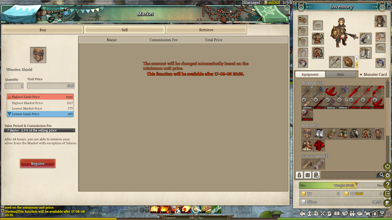 when i tried to use market it shows that function is unavailable till 8/8/2017 20:35. but now its 8/8/2017 23:01… i really need to sell my thing