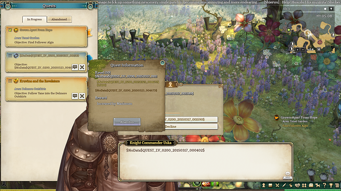 Same. Before the maintenance the text displayed correctly. Now it simply states $NoData$ on all quests and text. I am in the Grand Corridor within the Main Chamber.