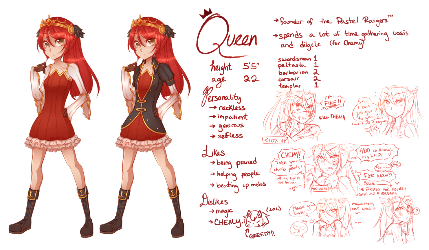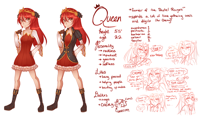 my templar’s personality is just based off the fact that i would just facetank everything while playing her and now her only purpose is to farm me uosis. and red hair is nice hehe…