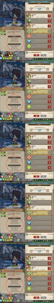 - When investing multiple points at a time into a single skill, the top section in the tooltip which describes the effects of that skill at its current level do not change despite the number of the skill level rising, and neither does the bottom section which describes the effects of the next skill level. After finalizing the points investment, only then will the tooltip update. All the while, the number of the skill level is rising in the tooltip without the effects being updated. This problem renders the whole idea of showing you the effects of the next skill level to be redundant, as you cannot use it to gauge whether or not you would like to invest that point until you’ve already invested it. Screenshot: http://i24.photobucket.com/albums/c44/Duosako/Skill%20Raise%20-%20No%20Change_zpskkgctgzi.png~original
