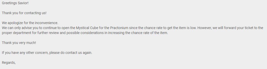 You guys “GMs” or anyone from IMC said that you created Mystical cube/Practonium for those player who are not doing Earth tower/Solmiki runs to catch up with those hardcore player. But how can i catch up if my F*CKING Mystical cube still giving me potions and mithril ores for 8months and counting.