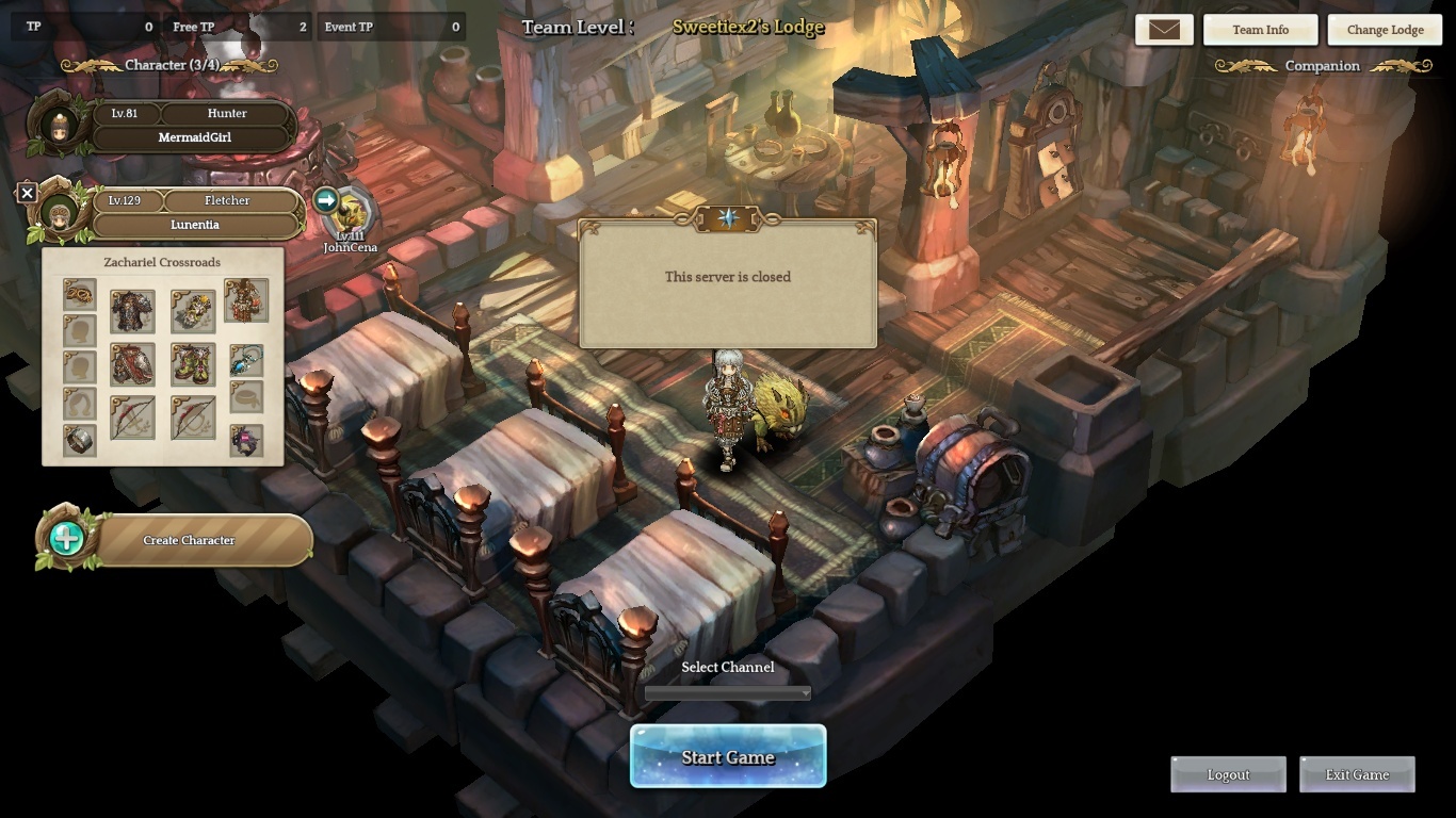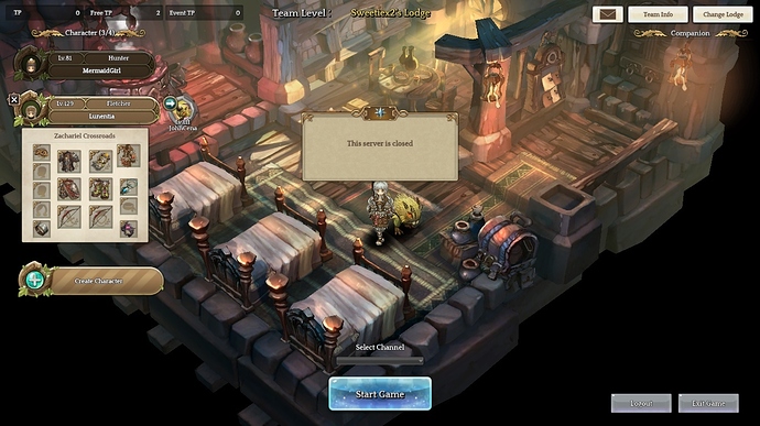 I was in Zachariel Crossroad and when i switched channel, i got disconnected and moved to character lodge. I can not enter the world because there was no channel to choose.