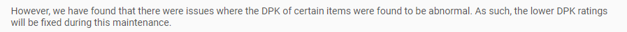 “However, we have found that there were issues where the DPK of certain items were found to be abnormal. As such, the lower DPK ratings will be fixed during this maintenance.”