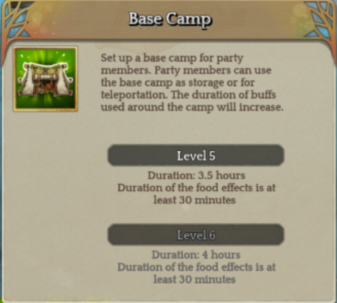 I have base camp on level 1, since the description tells me it’s only for a longer duration of the camp it self which is 1:30 hours, and within that time you can pay 2000 silver to extend back to the max duration time.