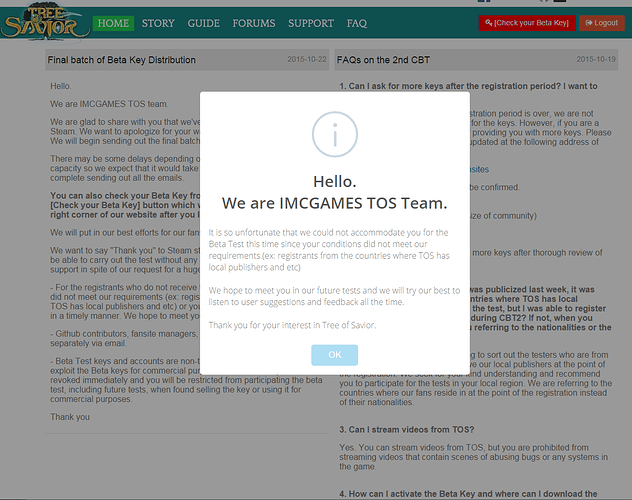 It is so unfortunate that we could not accommodate you for the Beta Test this time since your conditions did not meet our requirements.(ex: registrants from the countries where TOS has local publishers and etc)