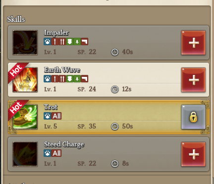 I would go with Trot lv5, Earthwave lv5, Steed Charge lv4 and impaler lv1