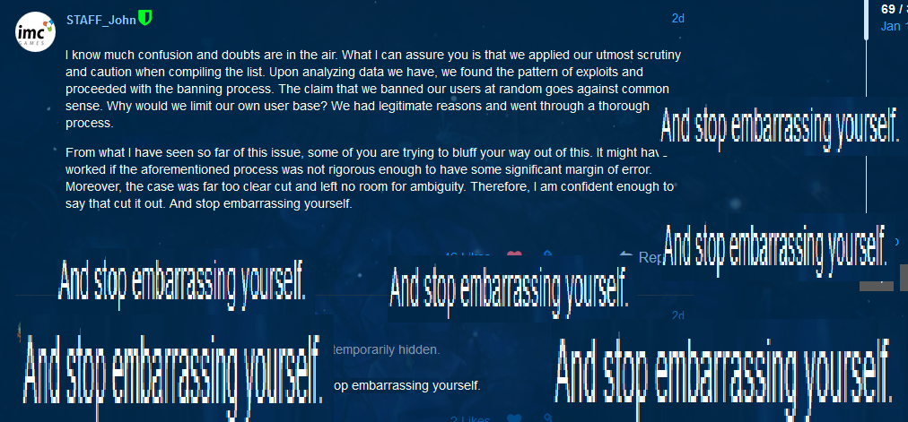 However I feel it’s good for IMC to start banning people and you will not lose much on the next event (just a chicken hat).