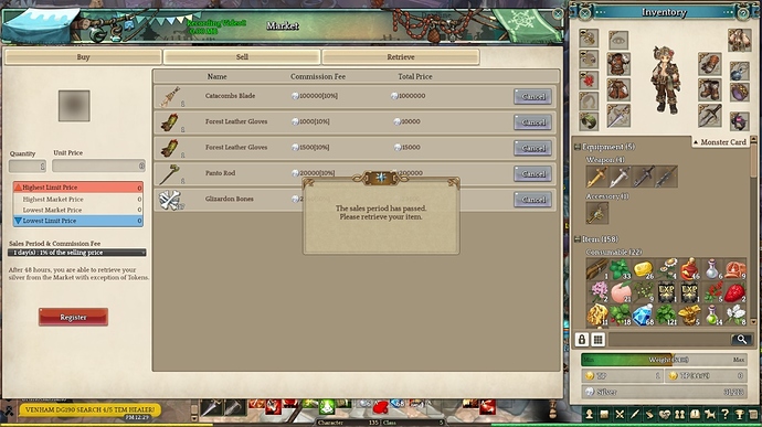 Item is on the market, when I try to cancel, shows a message that I need to retrive the item but he is still on the list to buy. The item is a Catacombs Blade.