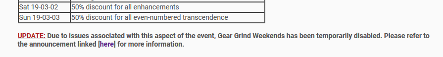 “Power of Goddess” is an event that holds other events. They are disabling temporarily “Gear Grind Weekends” (which is part of Power of Goddess) while other parts of the main event (Power of Goddess) remain untouched.