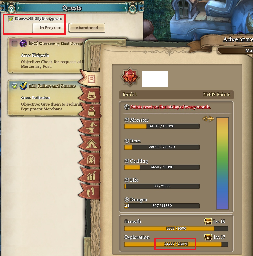 Collections/ Quest (includes hidden quest/hidden class quest) / Map exploration/ Titles.