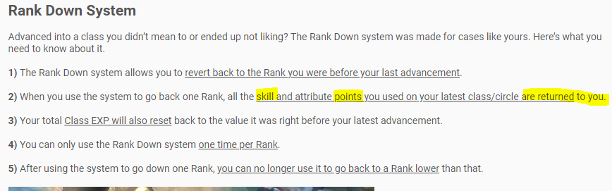 From the post of the dev(link below), it is written that When you use the system to go back one Rank, all the skill and attribute points you used on your latest class/circle are returned to you.
