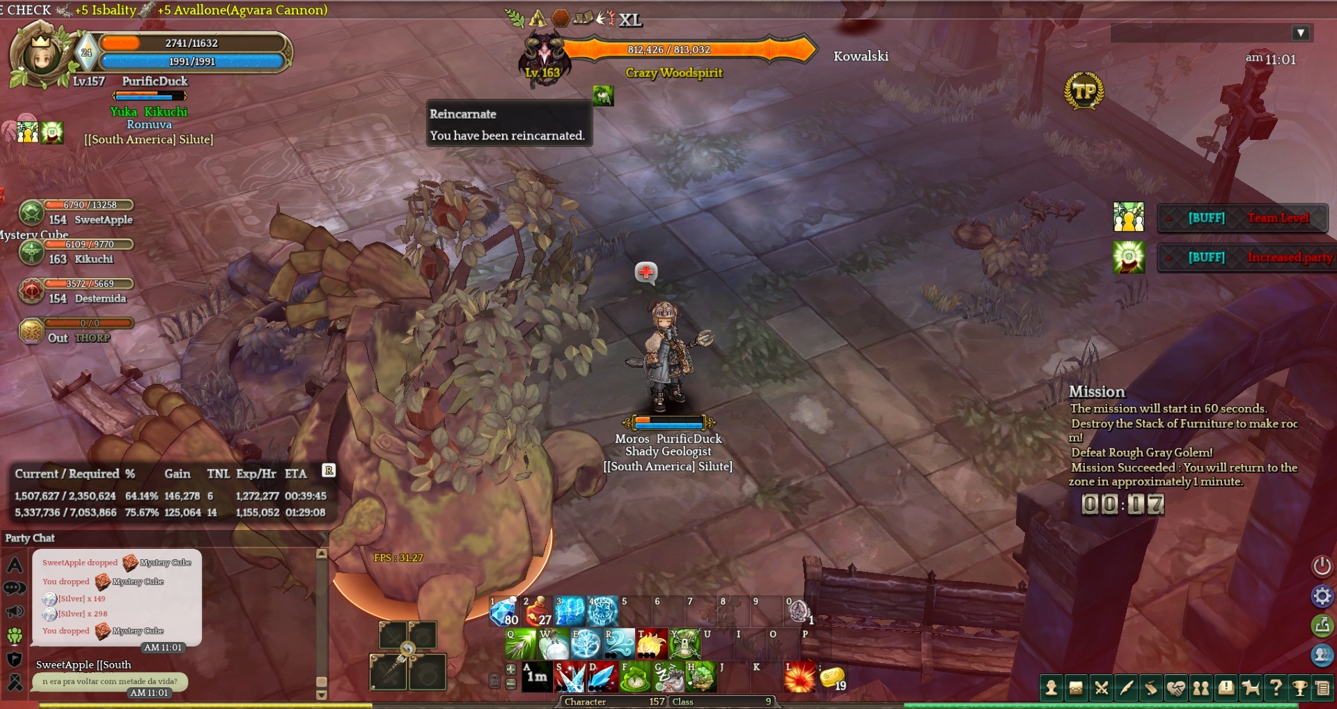 Doing the first mercenary mission Siauliai; playing as a Wiz1Cryo3Chrono1 lvl 157: use reincarnate lvl 1 to bosses; first one respawned, but 100% instead of 2%; we kill it, then when the cd was ready, I use it again in the final boss (tree), he spawned again (lucky (?)) but again with 100% hp, and the dungeon ended 60 seconds after (we cannot kill it under that time)