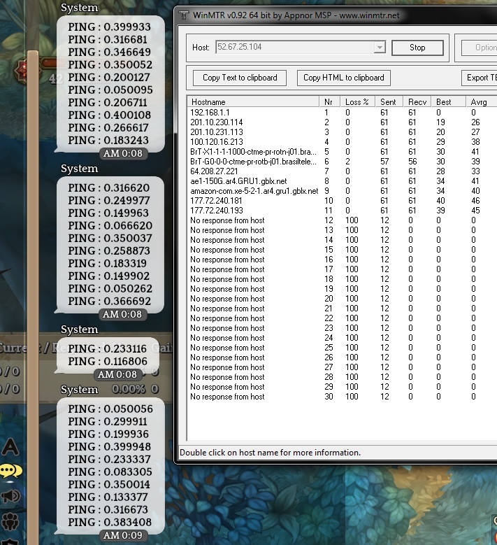 Here, ingame ping AND a tracert directly to server 52.67.25.104 (the real one)
