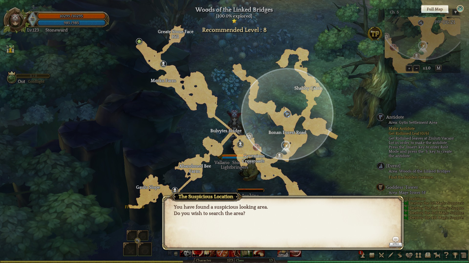 Woods of the linked bridges; “You have to step on stone to see me near the tree.” The first stone steps in the circled area, go along the left map wall going under trees you should find it.