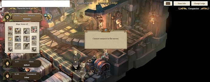 Exploring the map, Channel 1 Mage Tower 5F, looking for mineloader, and then walked my way to the portal leading to Mage Tower 4F. After the loading screen, Got an error saying cannot connect to server and was logged out.