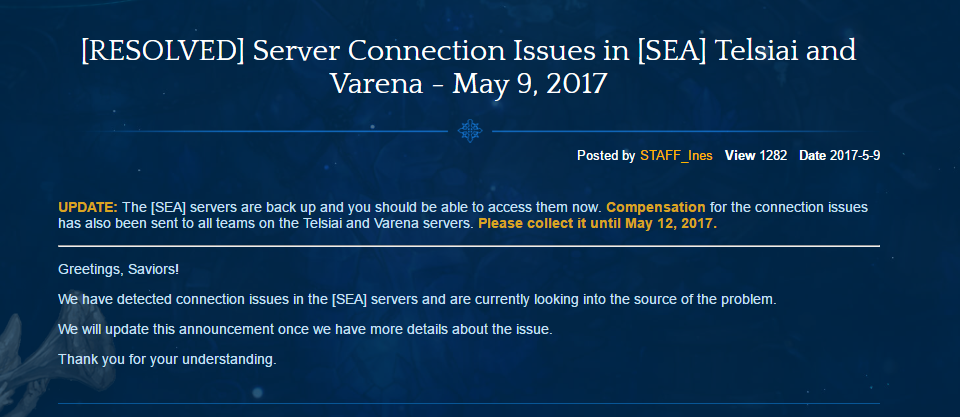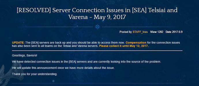 We have made an announcement regarding ‘Server Connection Issues in [SEA] Telsiai and Varena - May 9, 2017’.