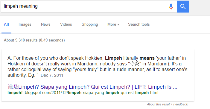 lim peh is a hokkien slang for āyour father meā. Hokkien is a dialect of Chinese.