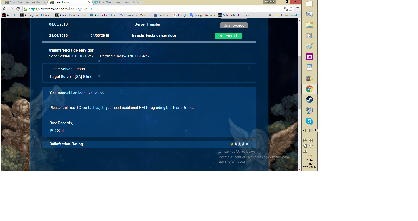 Hello, I wanted to know why you have not answered my tickets.The server transfer has not been completed, even with my ticket responded transfer, will have to do many days, and they are many days without up. It was for my characters go from Orsha to the new server [SA] Silute.
