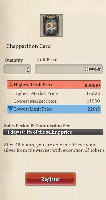 Reason for Suggesting Change : The maximum price should be 5 million for both cards. It costs around 50 cards to get one card to level 10, and the price for one card is ~90k, so a end game card like ellaganos or chapparition would cost at least 4m silver. Basically the market does not allow players to sell leveled cards at the moment because of this restriction.