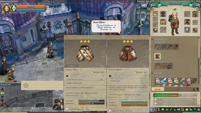 Now I’ve noticed there at least at my low level of 43 no actual difference in types of bonuses the armor gives. It’s not like Cloth always gives you SP or Leather gives you DEX or Plate gives you more armor.