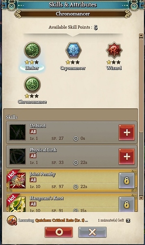 Same problem my skill tuck in 1min i tried to logout and login,quit the game but the same,i tried to delete the attribute and try a new one but didn’t work always stuck in 1min…