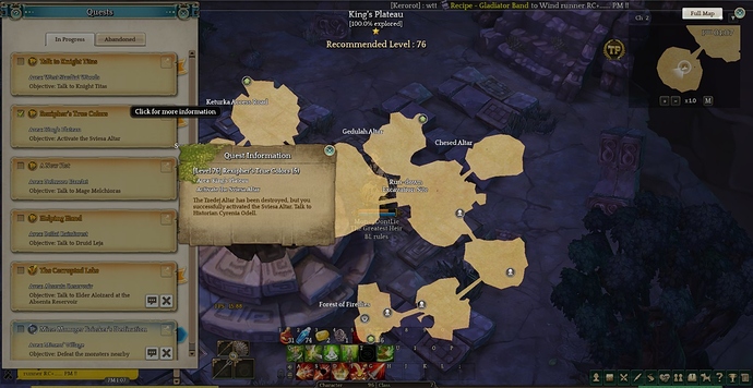 Bug Description : I was doing Q and stuck at Rexipher’s True Color at King’s Plateau map. As you can see in the screenshot, the Q itself didn’t show up on the right side and wasn’t marked on minimap. (I should have been moved to a cutscene in which Historian Odell is kidnapped by Rexipher when I stepped to Kertuka Access Road area. But when I did, nothing happened. ) I can’t start over since this Quest doesn’t show “abandon” option. Thus I can’t process any further.