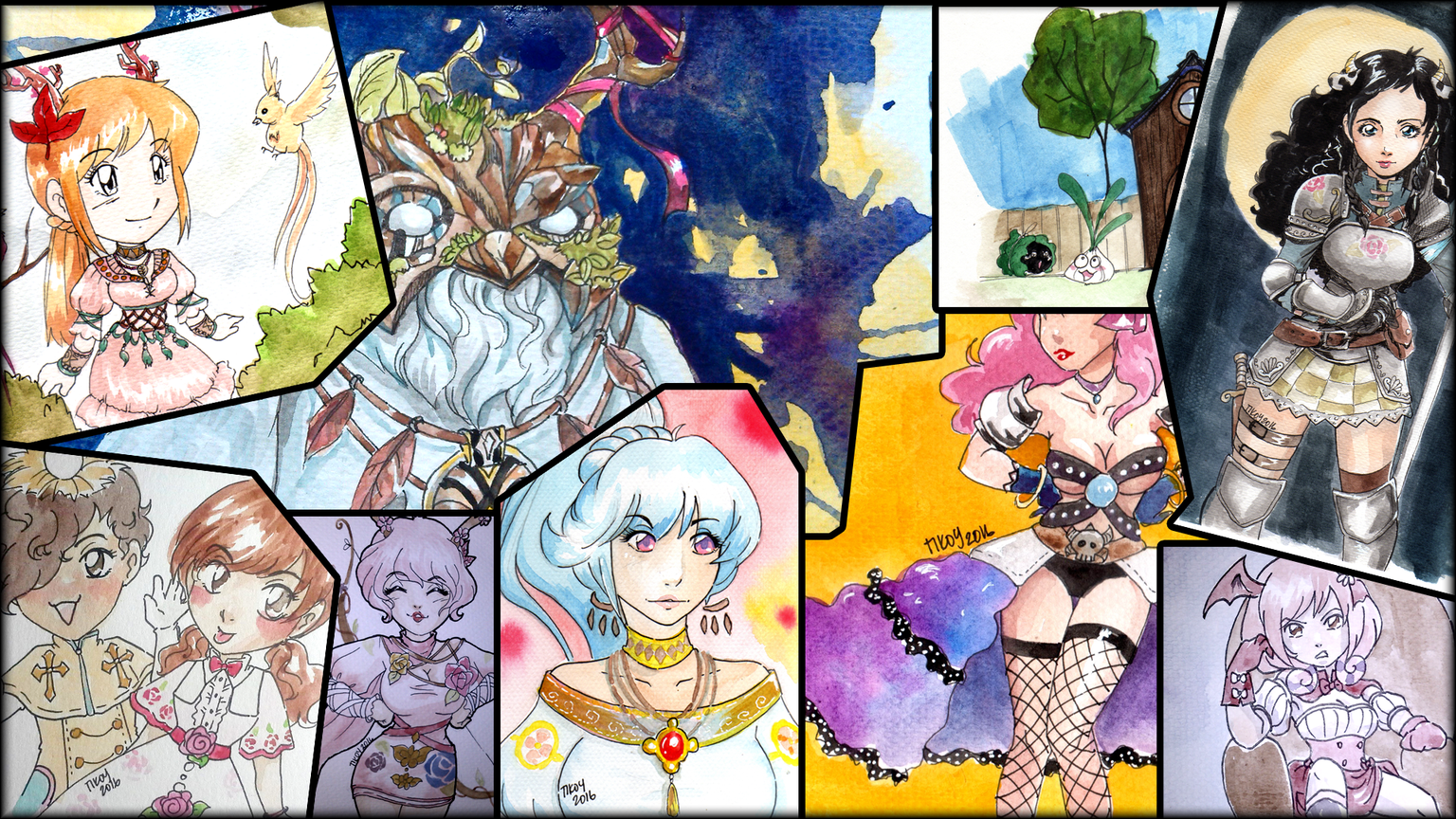Description: This is a collage of the watercolor fan art i’ve made since the game went live last april. These include a few npc/monsters and various characters/players. i can’t spell all your names but i’ve seen you. is all that matters
