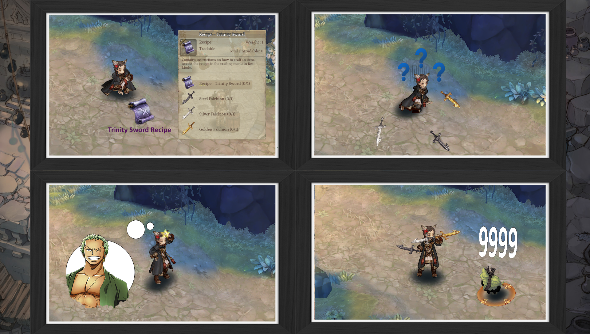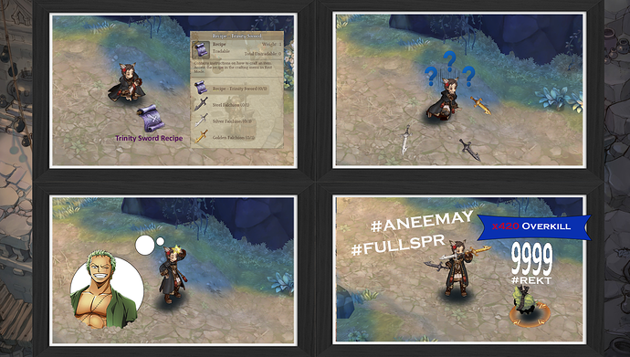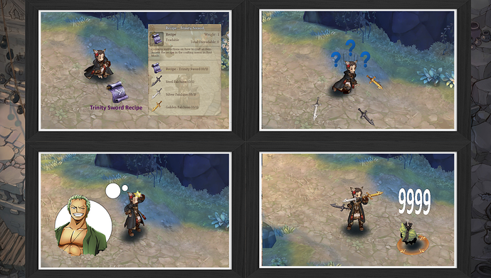 Some recipes are strange like, some leather gear are not made from leather, a hat is made from vubbe blood mostly, so i made this pics about the Trinity Sword recipe. I’m not good at drawing so i tried to put screenshots and so, not best art, but i liked the concept / idea.