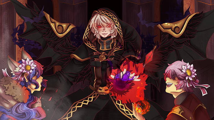 My sibling and I absolutely adore Rex’s design, especially his demonic bats-y look he has when we fight him in the fifth floor. I drew him transforming along with bats to boost the Halloween theme of the subject. Also present is my sibling’s character, a pyromancer, and my cryomancer preparing for a good fight! I hope you enjoy.