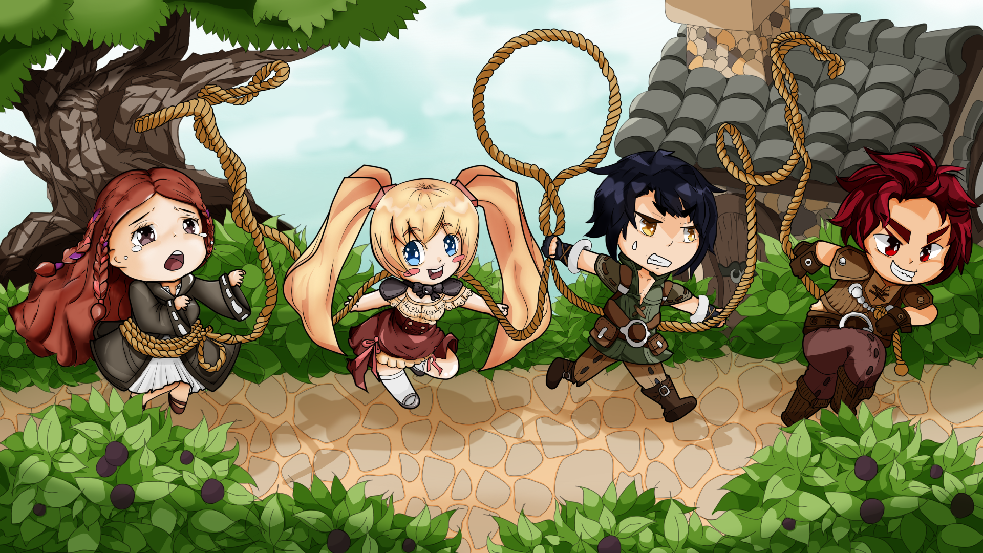 My fanart is a coordinate concept with the 4 basic classes. I got the inspiration from Cleric’s costume, which it has a rope round her waist. I also put the gimmick on the rope by the game name. Therefor Swordman is leading a party with Archer, Wizard and Cleric by taking a rope from Cleric’s costume.
