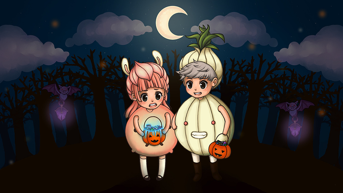 My boyfriend and I play ToS together (he’s archer-ranger-fletcher and I’m wizard-cryomancer-psychokino.) While I really love playing this game, I’m really not very good at it thus resulting in a few mishaps every now and then. So for this artwork I decided to depict our characters trick-or-treating around in monster costumes (hanaming and kepo!) but then my character accidentally looses control of her ice powers and freezes her candy ಥ_ಥ